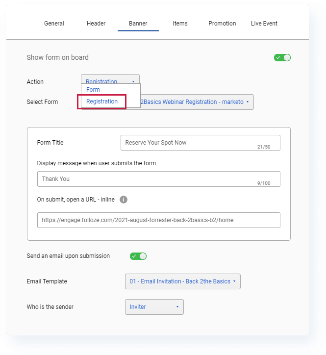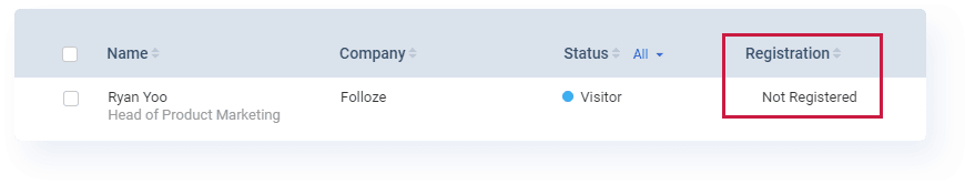 If a Board visitor completes a 'Registration' form, Folloze will record an all-new action to track that the visitor has just registered for your upcoming event, meaning you'll now be able to track registration status for your invitees natively inside Folloze.