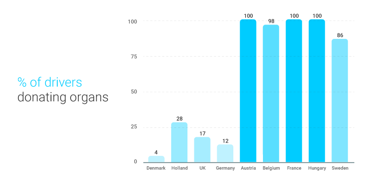 One of the most famous examples of this behavior deals with organ donation. In his 2008 Ted talk, Dan Ariely, a professor for Economics and Behavioral Psychology at Duke University, presented the strong correlation between the tendency of people to donate organs and their role in the decision (i.e. whether the default in their country was opt-in or opt-out… spoiler: the countries on the left were opt-in, those on the right were opt-out).