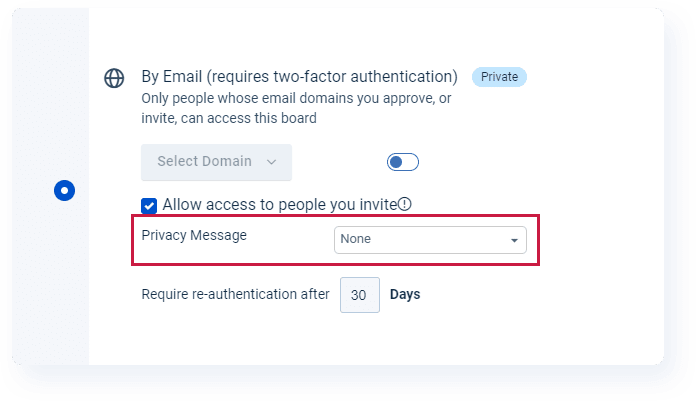You can now set a privacy message to appear when authenticating Board visitors by email. Since visitors are identifying themselves, your organization may be required to share privacy information on submit. If so, you can select the appropriate privacy message in the same place where you enable 2FA.