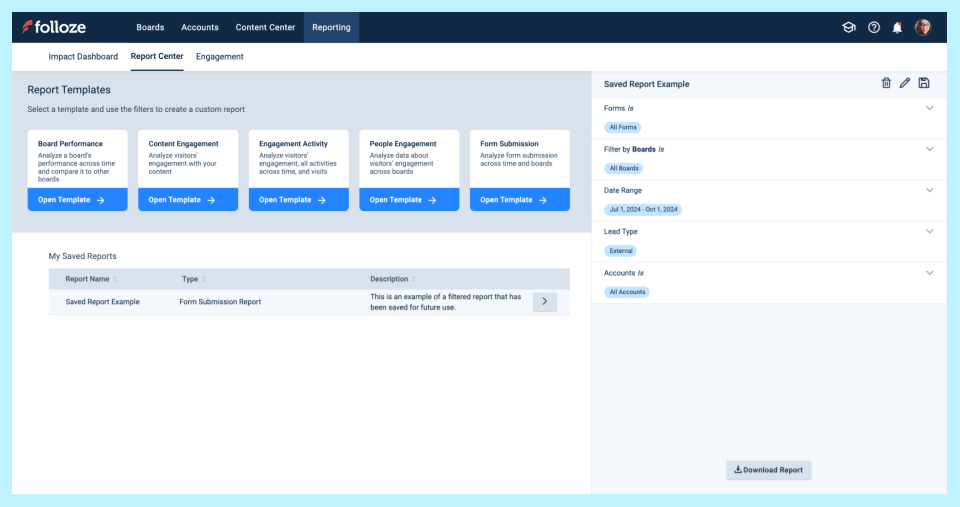 You can still access, customize, and save various reports in the Report Center. Download them as CSVs at any time. In combination with the Impact Dashboard, your data presentations will be a breeze to build.