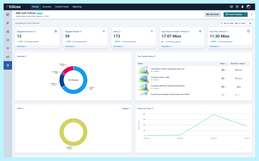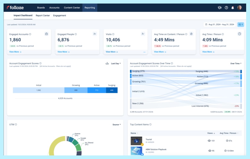 This Product Spotlight features the Folloze Impact Dashboard and Account Engagement Scores, which empower go-to-market teams to clearly demonstrate the effectiveness of their strategies and make informed decisions. These tools simplify complex data into actionable information. They enable informed decision-making, and help marketers assess campaign effectiveness and account engagement in real-time.