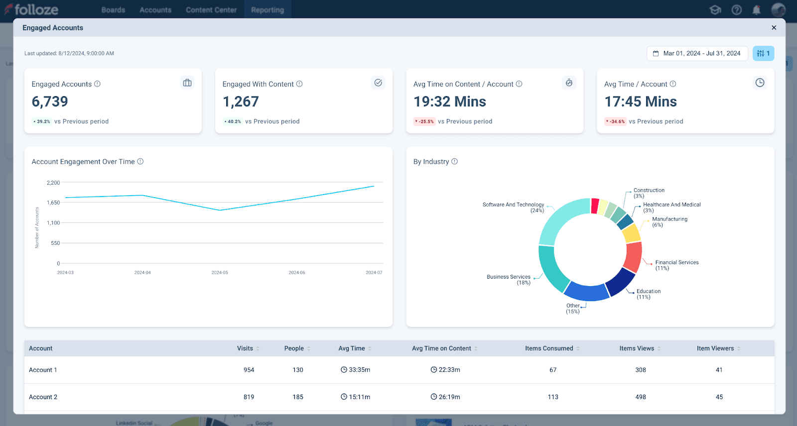 Click the View More button under Engaged Accounts to see additional related information and trends. For example, Account Engagement Over Time, Accounts by Industry, and more (shown below).