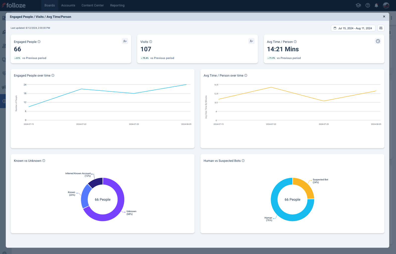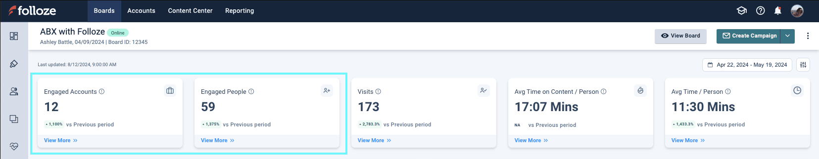 *The top bar of the Impact Dashboard shows the Engaged Accounts and Engaged People widgets (highlighted above). They display the total unique accounts and people that had at least one person engage with the Board.