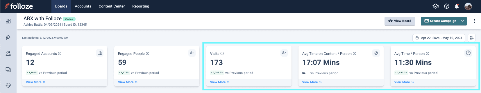 Review "visit" and "view time" data holistically. If your Board shows a short average view time, it may indicate that the Board’s design, copy, or content isn't capturing the interest of prospects landing there. On the other hand, if your Board isn’t getting the number of visits you expect (but engagement levels are reasonable) this suggests that your Board is effective once prospects get to it. In this case, consider adjusting your campaigns to improve click-through rates or use other methods to boost visibility.