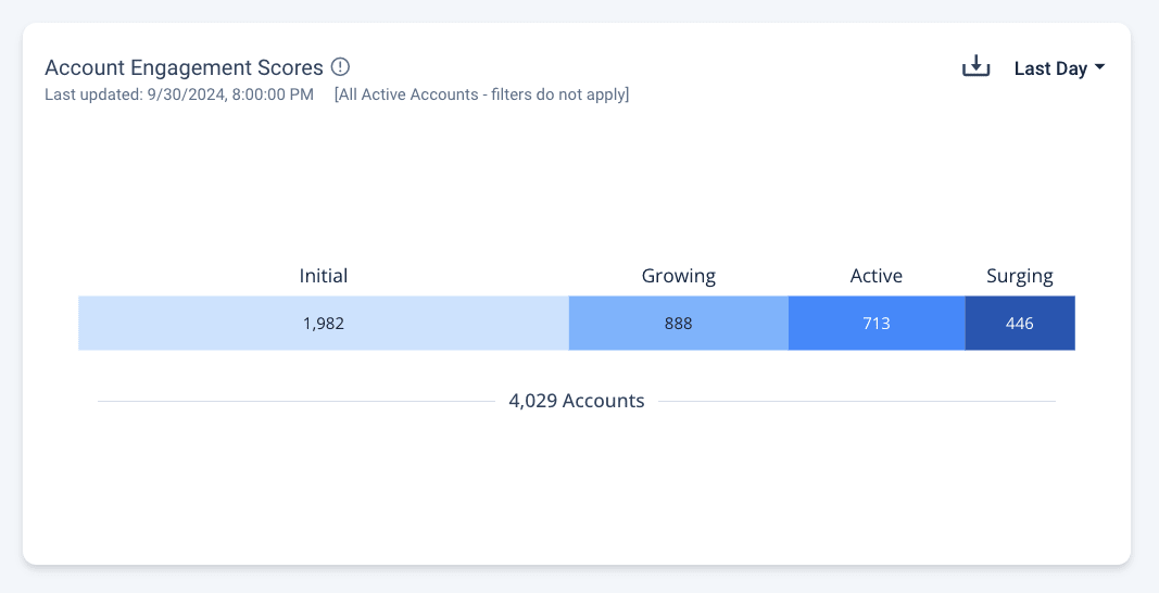 Scores are calculated with a multi-dimensional model based on account and prospect behavior and interactions throughout the buyer journey. This model incorporates various metrics such as content views, time spent on boards, time spent on content, intent-driven calls-to-action, and prospect volume. Recent engagement is more heavily weighted to keep scores current. Scores are also updated daily to maintain relevance and accuracy. Please note that scores are calculated for all active accounts and are unaffected by any filters other than date range.