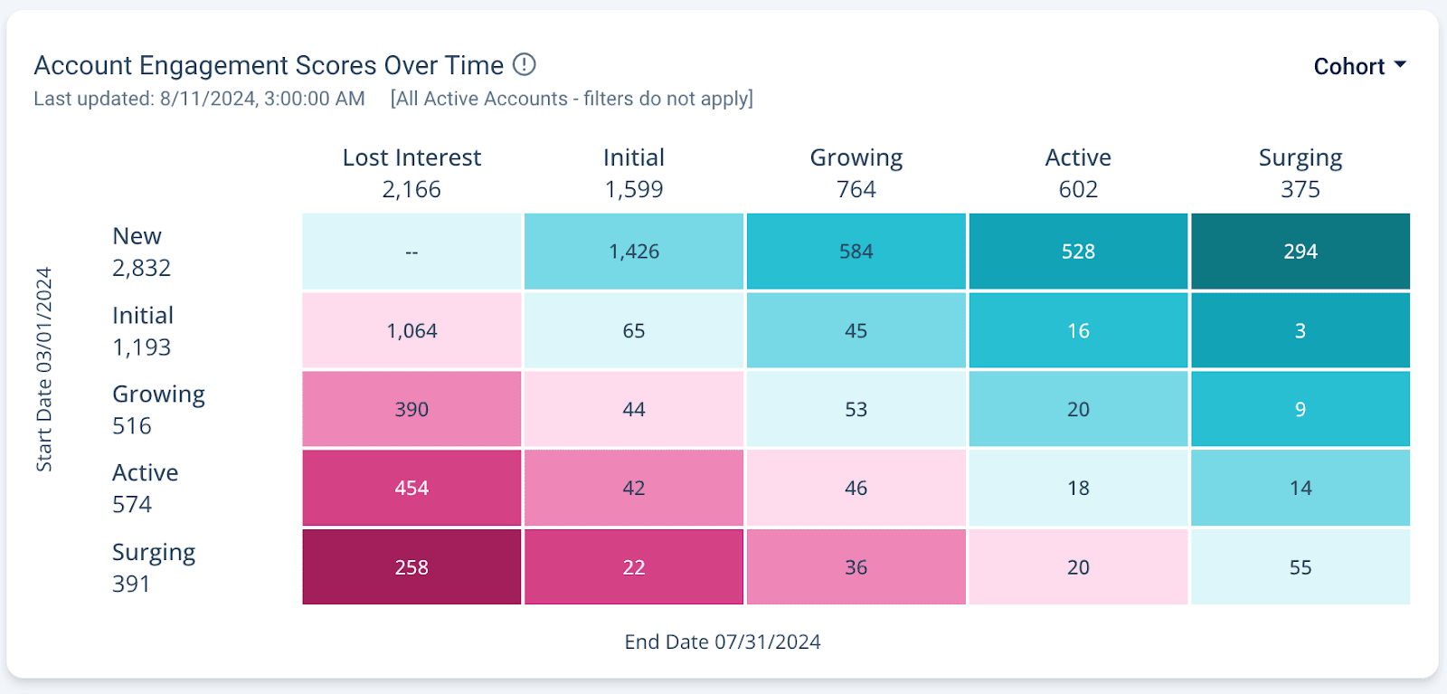 View your Account Engagement Scores Over Time (shown above) and even see their exact movement with Cohort view (shown below). Change your view using the top-right dropdown.