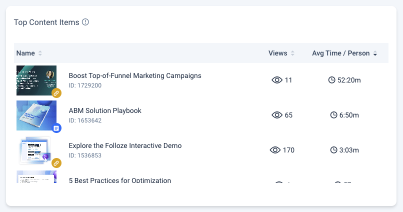 *Top Content Items widget. Sorted by Avg Time / Person.