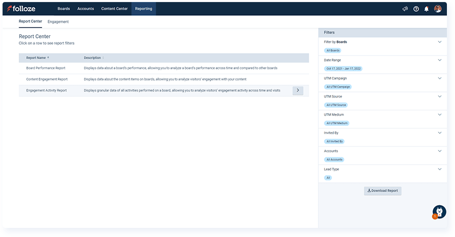 The Report Center is a brand new feature available to all users where you can create more granular, customized reports based on your needs. Whether you want a report centered around Boards, content, or engagement activities, there are several report types available, and each report type has its own list of additional options for filtering so that your report only contains the data you're looking to include (e.g., report on engagement across a specific time period).