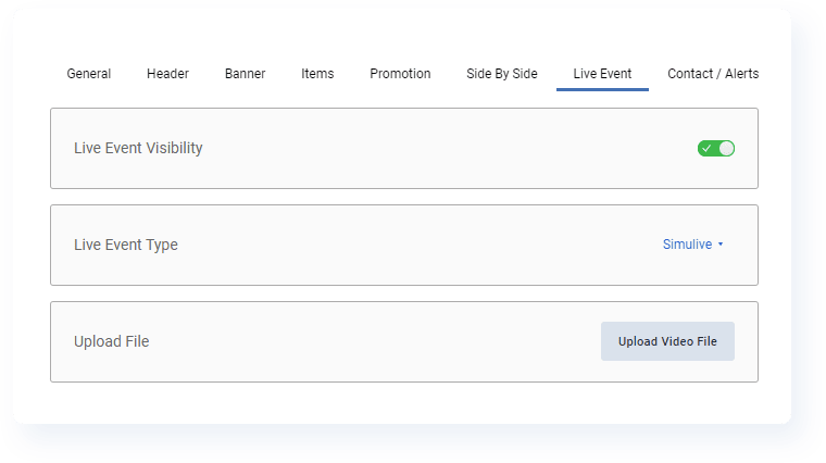 To setup a simulive virtual event, select 'Simulive' under 'Live Event Type' within the Board Designer tab. Once selected, you'll upload your video file directly into the Folloze platform.