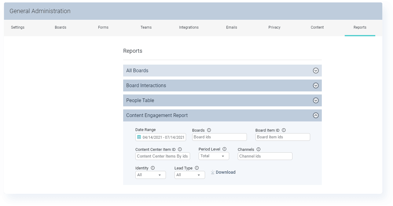 When generating a report, admins can take advantage of filtering options, including which Board(s) and/or channel(s) to pull content performance for and what time period to display engagement from.