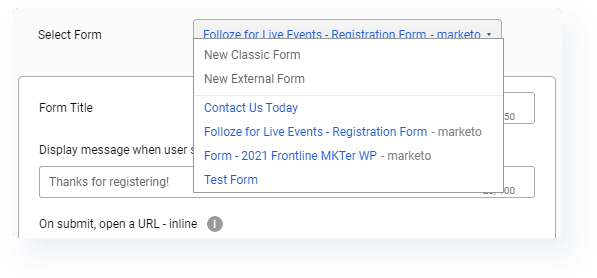 Once a Company Admin has made a Marketo form(s) available for use, you'll be able to select it from the 'Select Form' dropdown list regardless of how or where the form is being presented.