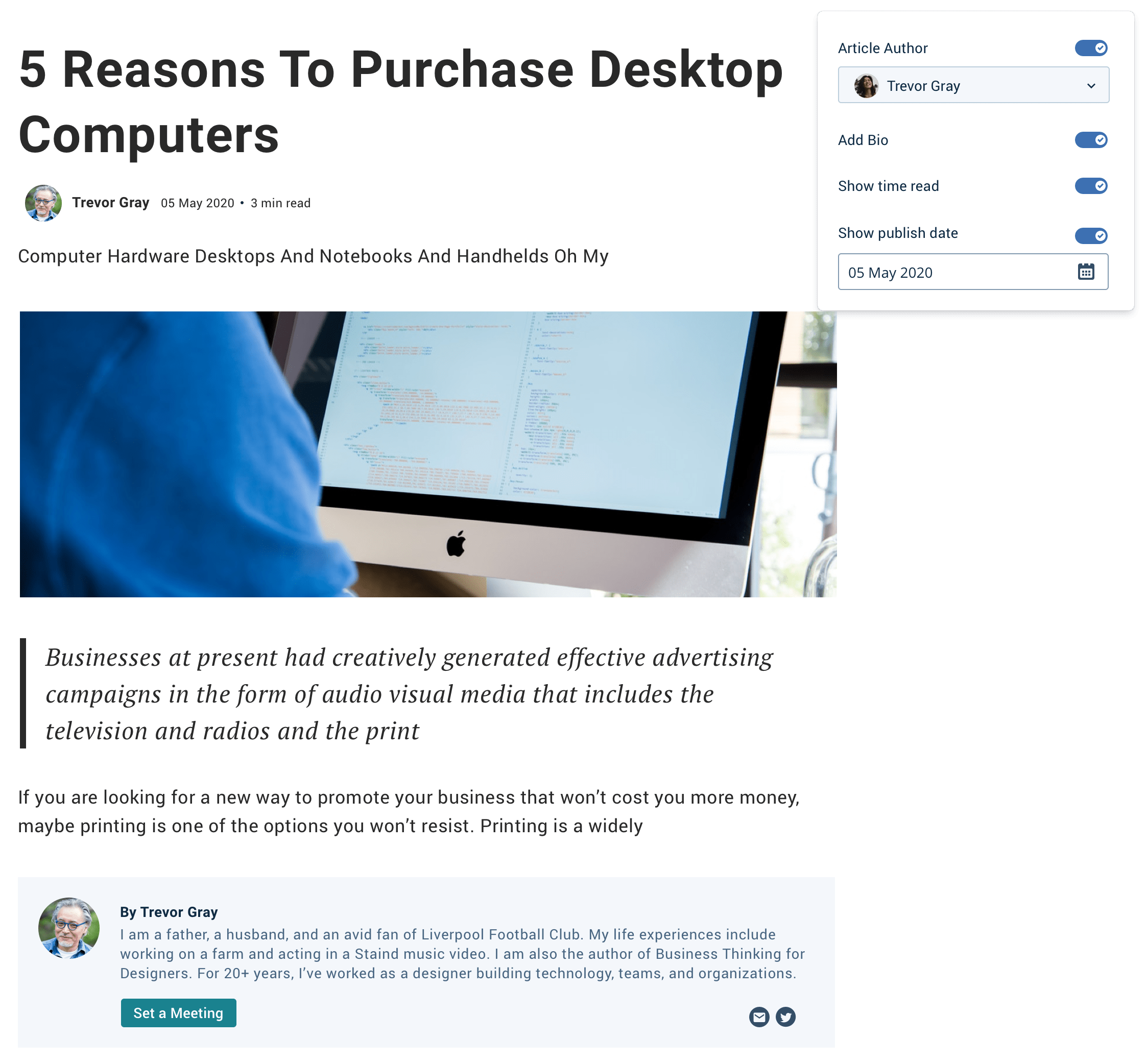 This new feature means you can set up a proper Author Bio with additional details about who the Author really is. It's a great way to humanize an Article's Author and elevate their name and face within the Article itself.