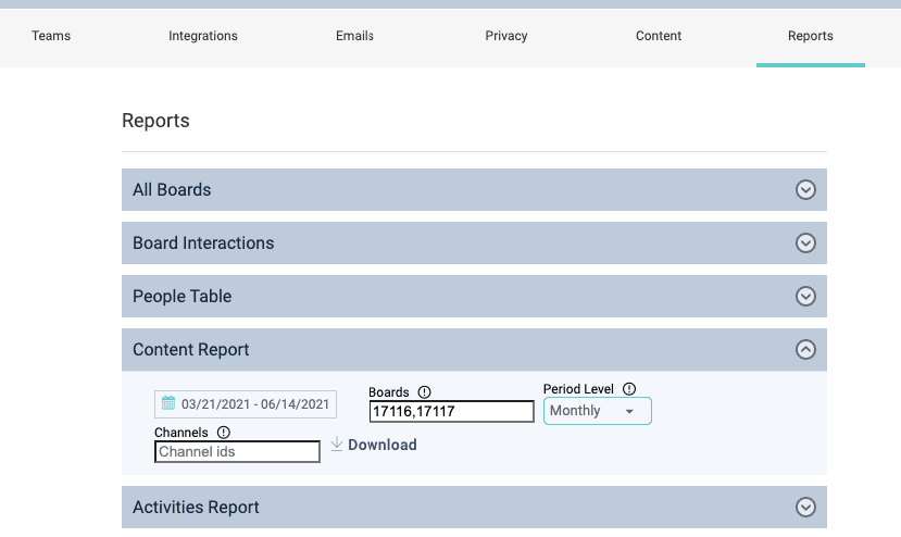 This Content Performance Report allows you to pull and download a report that displays content engagement metrics per individual content asset. Admins will have the ability to define several additional filters, including which Board(s) and channel(s) to pull content usage for and what time period to display engagement from.
