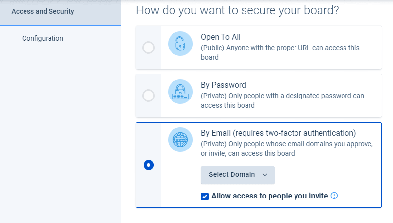 We've expanded the Access & Security options that are available to you for protecting your Boards. This means there's a new, even more secure option for limiting your Board to only specific, pre-approved audiences. In addition to random URL tokenization and password protection, you can now fully secure your Board using 2-factor authentication to ensure only authorized visitors can view your content.