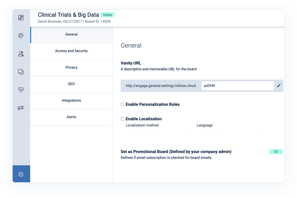 In an effort to further simplify the process of building a Board, we have moved several Board-level settings from the General tab of the Designer to the Settings tab (pictured above). Moving forward, you can find your more general settings, like a Board's Vanity URL and the option to Enable Personalization Rules, by clicking the Settings tab in the bottom left of the Board Builder.