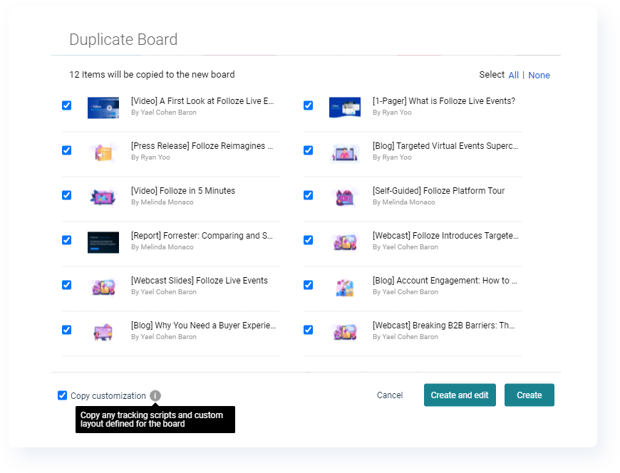 When duplicating a Board, a new toggle appears in the bottom left of the pop-up dialogue that allows you to carry over these tracking scripts and design customizations if you'd like to do so.