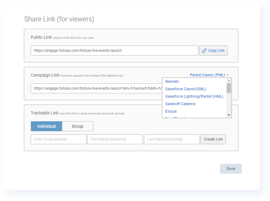 Campaign Links have been updated to properly support all the variants of merge fields used by various Salesforce platforms. Within the Campaign Link menu, you'll see these three options: