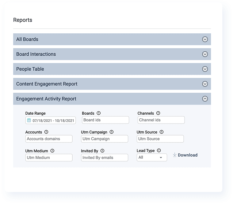 To pull an Engagement Activity Report, you'll need to enter either a Board ID(s) or Channel ID(s) before Folloze can prepare a CSV file of all relevant engagement activities.