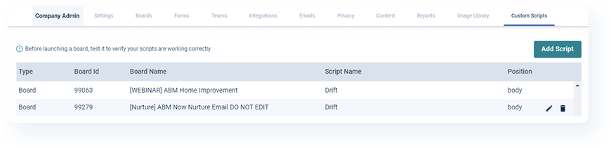 Folloze has always supported the implementation of custom scripts and tags on any or all Boards (e.g., Google Tag Manager implemented org-wide), but actually inserting the right script into the right Board has never been a completely self-service activity. This enhancement fixes that and provides any Company Admin with a self-service window to view all scripts that are currently deployed and to implement new ones as well.