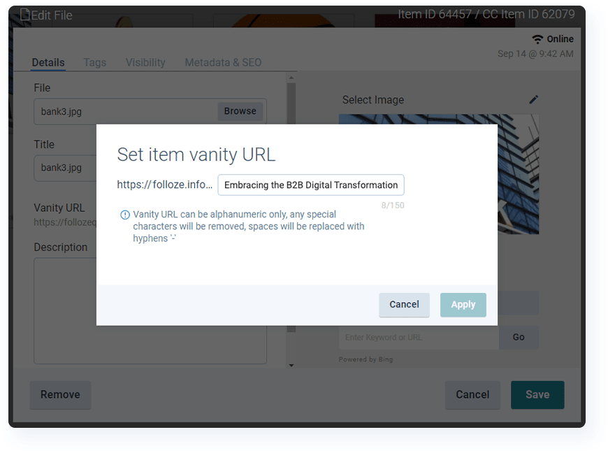 Currently, Folloze auto-generates an item's URL based on the title of that content, but with this next update, you'll have full control over the item URL if you don't like to many any changes to or completely replace the default (just like you can do at the Board-level today).